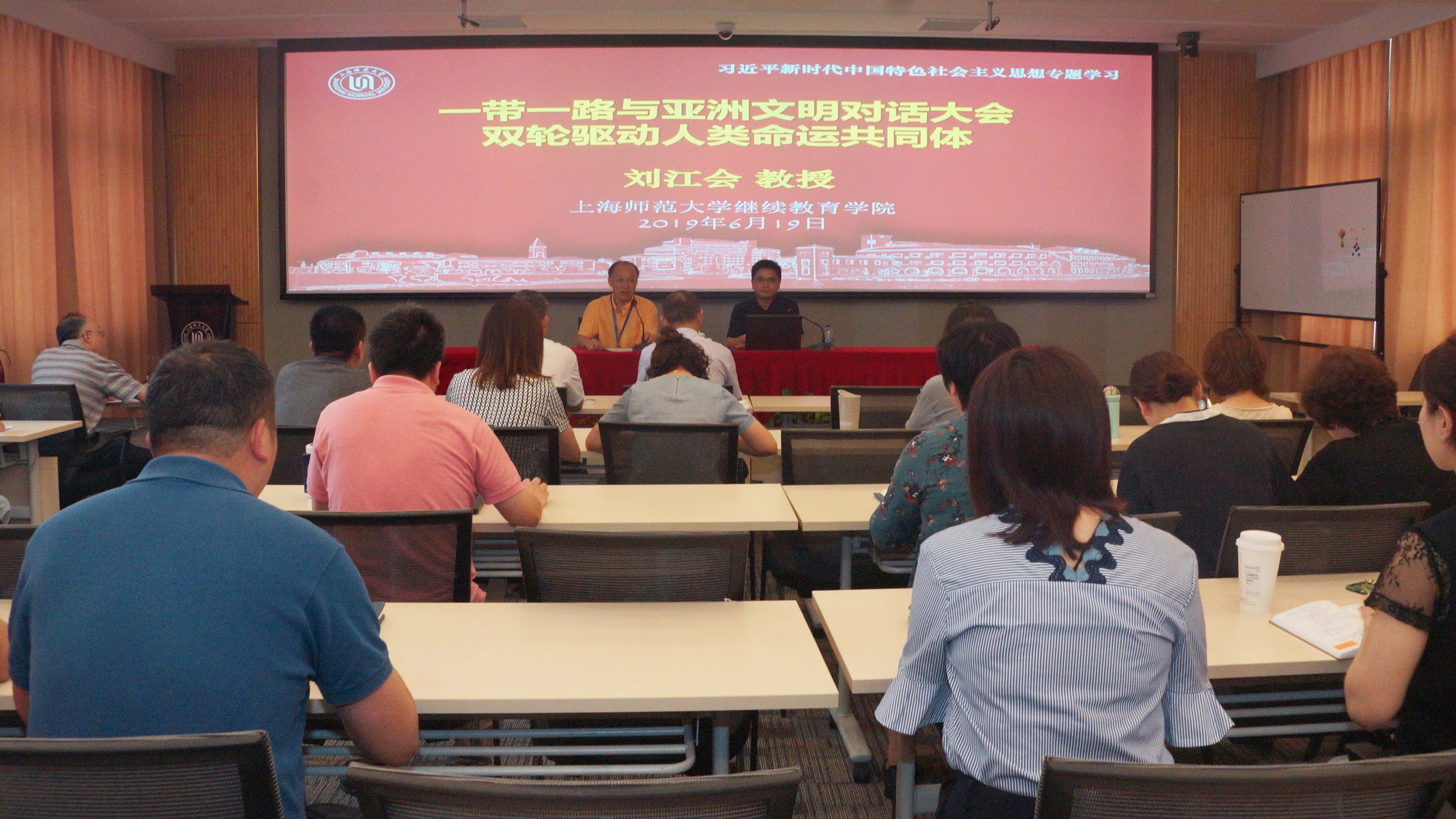 6月19日,学校习近平新时代中国特色社会主义思想专家宣讲团成员、商学院刘江会教授以“‘一带一路’与亚洲文明对话大会双轮驱动人类命运共同体”为题,为继续教育学院全体教职工宣讲习近平新时代中国特色社会主义思想。