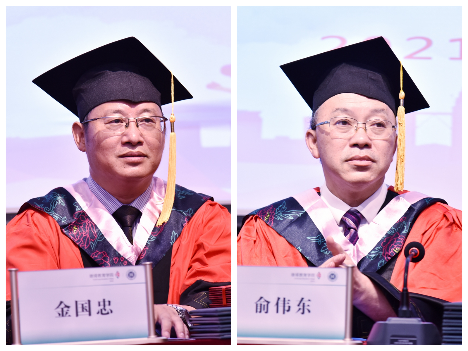 金国忠宣读“上海师范大学成人高等教育2021届毕业生名单”,俞伟东宣读《关于授予上海师范大学2021年高等学历继续教育本科毕业生学士学位的决定》。主席台就座领导向毕业生代表颁发毕业证书和学士学位证书,为他们正冠拨穗。