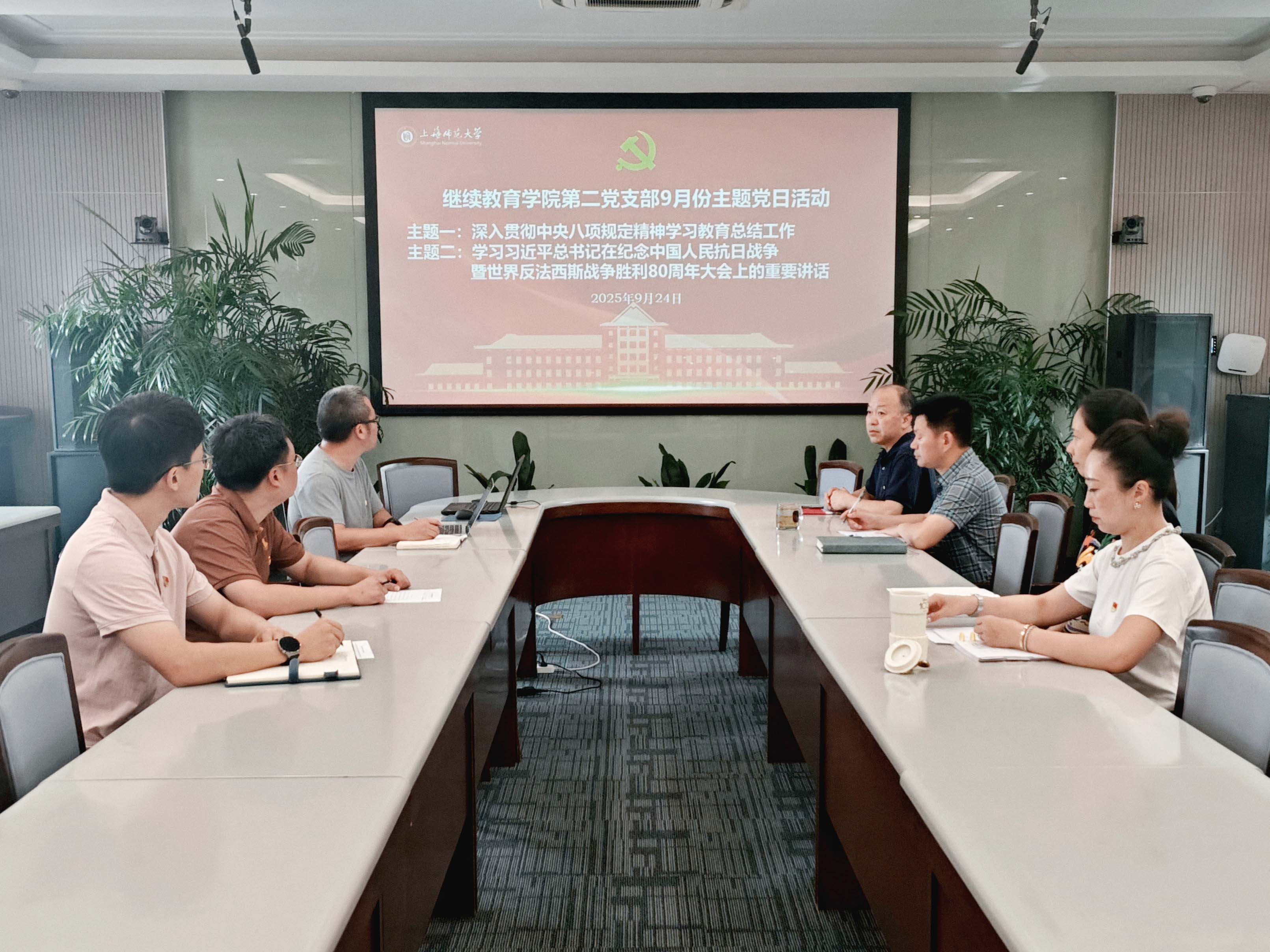 根据学校和学院安排,继续教育学院第二党支部举行9月份主题党日活动,扎实做好深入贯彻中央八项规定精神学习教育总结工作,并学习习近平总书记在纪念中国人民抗日战争暨世界反法西斯战争胜利80周年大会上的重要讲话。主题党日活动由支部书记潘国强主持,尤佳和宋晨祖老师作重点发言。