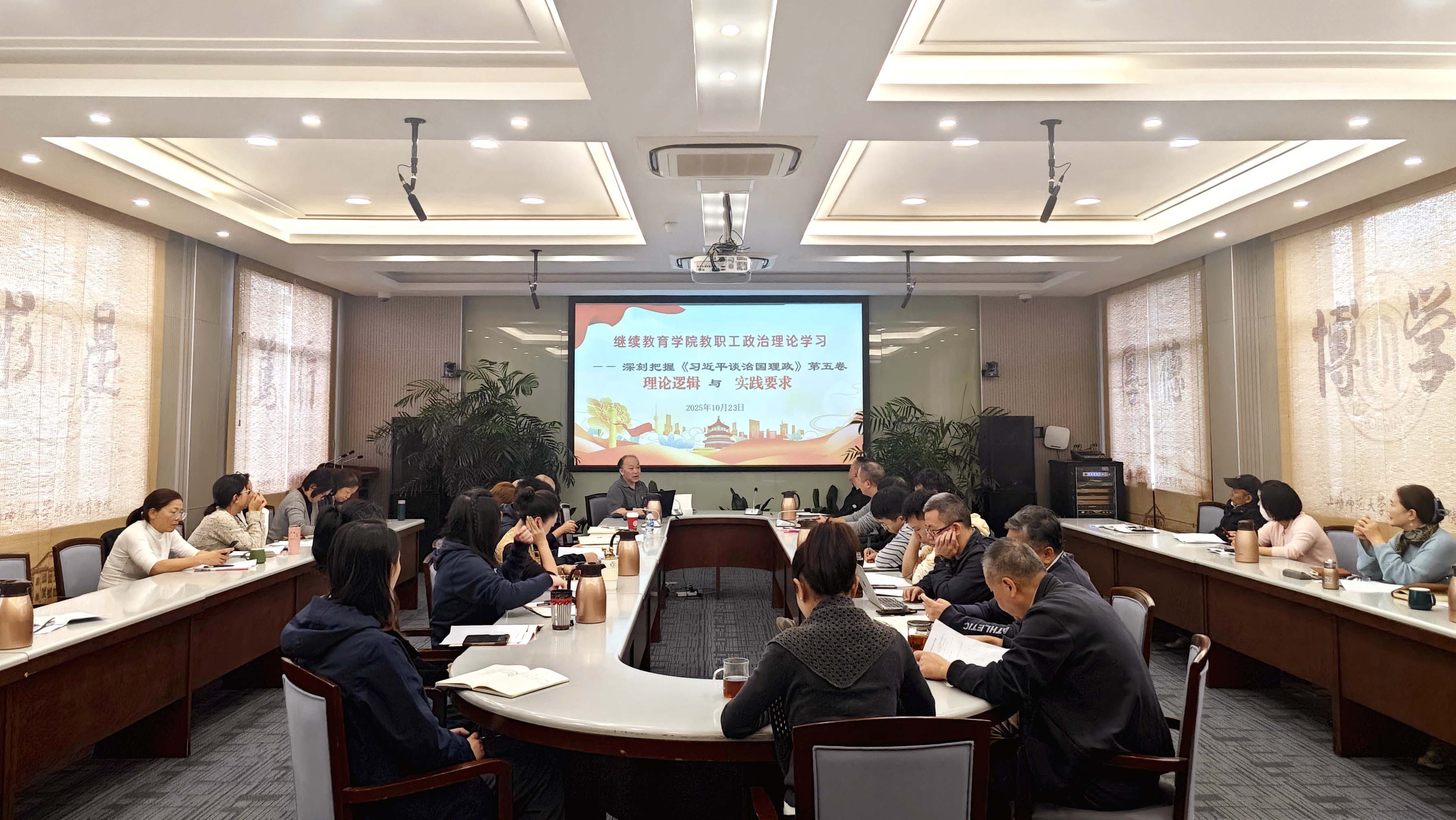 10月23日下午,为了深入学习领会《习近平谈治国理政》第五卷,持续增强学思想、悟思想、用思想的自觉性和坚定性,把学习成果转化为干事创业、推动高质量发展的实际成效,继续教育学院组织全体教职工开展政治理论学习会。会议围绕“理论逻辑与实践要求”的主题,通过“丰富内容、内在联系、重大意义、实践要求”四个部分,进一步推动全体教职工深刻领悟习近平新时代中国特色社会主义思想,为实现党的二十大描绘的宏伟蓝图而团结奋斗。学院领导班子及全体教职工参加会议,会议由党总支书记俞伟东主持。
