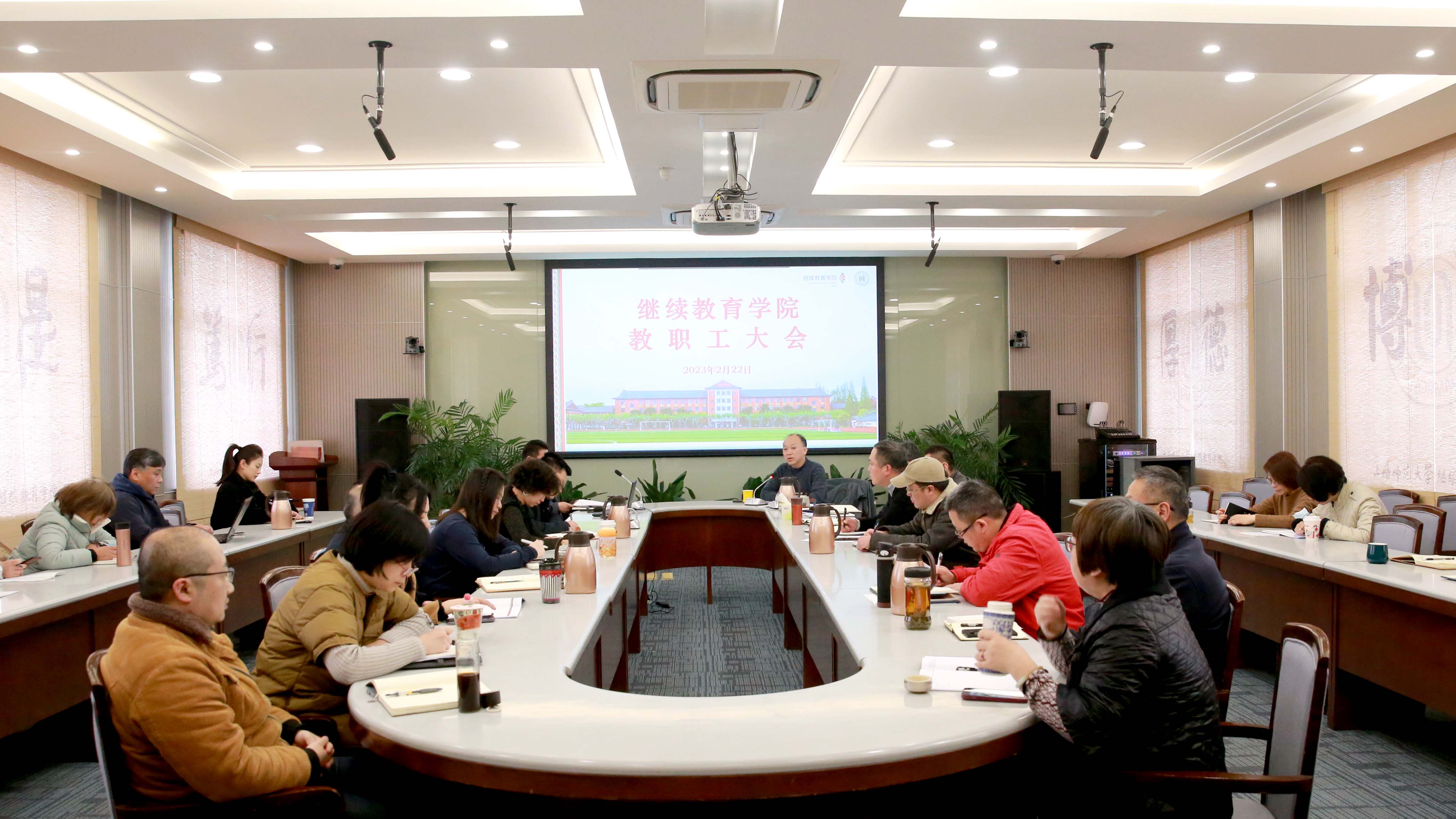 2月22日下午,新学期全院教职工大会在继续教育学院301会议室召开,学院党总支书记金国忠主持会议,院长俞伟东、学院领导和全体教职工参加会议。