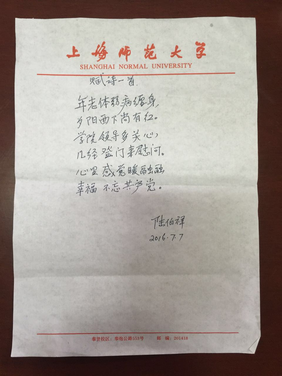 7月7日,继续教育学院党政工领导分成三个小组,共走访徐汇、虹口、奉贤区等多名离退休教职工,看望病休职工1名,离休干部2名,退休职工16名,学院领导热情询问老同志们的身体和生活情况,向他们介绍了学校及学院的发展现状,并送上暑期慰问金。老同志们对于学院领导一如既往的关心十分感动,家住奉贤的陆柏祥老师现场赋诗一首,表达了退休教工对党组织的感恩之情。